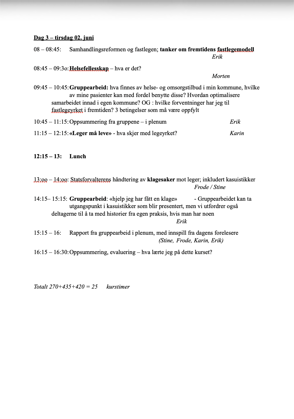 Kursleder: Erik L. Werner (spesialist i allmennmedisin, professor i allmennmedisin ved UiO og tidligere kommuneoverlege i Arendal)